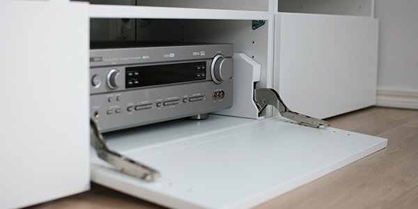 Viritin-vahvistin on turvassa. Vaihdoin TV-tason keskimmäisen vetolaatikon tilalle kääntöoven. Irrotin vetolaatikosta etusarjan, ja asensin sen saranoilla runkoon. Aiemmin viritin-vahvistin oli TV-tason päällä keräämässä pölyä, ja se sai myös ylenpalttisesti huomiota yksivuotiaalta kuopukseltamme.